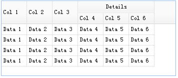 <thead> <tr> <th field="name1" width="50" rowspan="2">Col 1</th> <th field="name2" width="50" rowspan="2">Col 2</th> <th field="name3" width="50" rowspan="2">Col 3</th> <th colspan="3">Details</th> </tr> <tr> <th field="name4" width="50">Col 4</th> <th field="name5" width="50">Col 5</th> <th field="name6" width="50">Col 6</th> </tr> </thead>